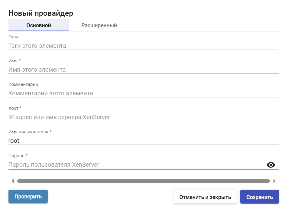 Для регистрации сервис-провайдера XenServer/XCP-ng перейдите в раздел **«Сервисы»**, нажмите **«Новый»** и выберите тип провайдера **XenServer/XCP-ng**.