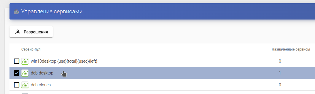 Здесь отображается перечень доступных сервис-пулов, с информацией о назначенных пользователям сервисах.
