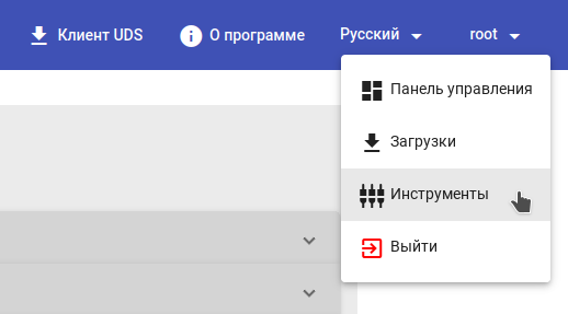 Раздел "Инструменты" доступен в меню пользователя (только для учетных записей с ролью *Администратор*):