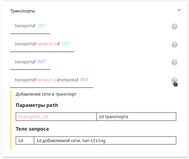 При нажатии на знак вопроса появится дополнительная информация с описанием запроса, а также параметров path и тела запроса (при наличии).