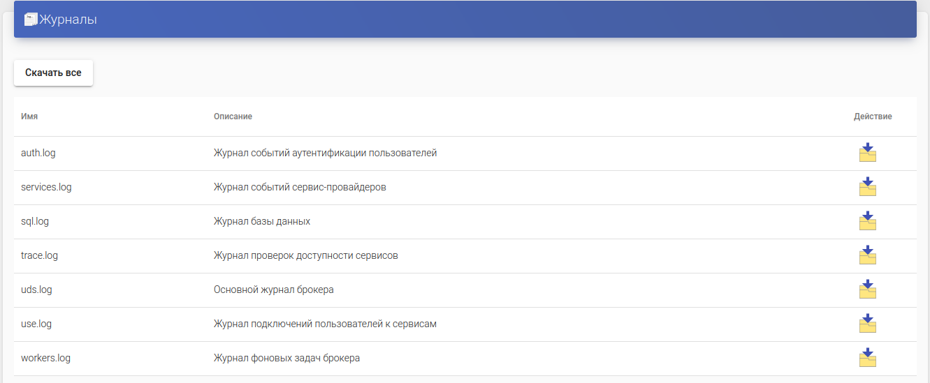 Вы можете скачать их по отдельности, нажав на иконку загрузки рядом с нужным файлом, либо архив всех журналов целиком, нажав на кнопку "Скачать все".