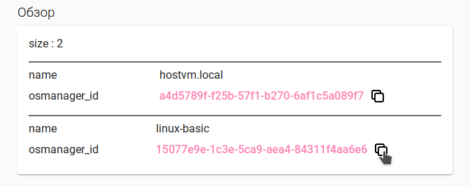 Для некоторых запросов, помимо кода состояния HTTP-ответа и полного ответ сервера будет доступно поле "Обзор" с перечнем найденных элементов в сокращенном формате (имя и id). Id элемента можно скопировать, нажав на иконку рядом, и использовать для дальнейших запросов.